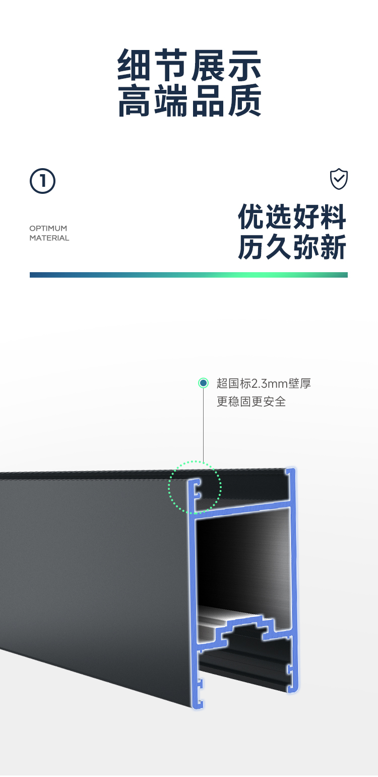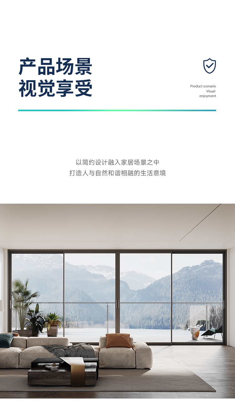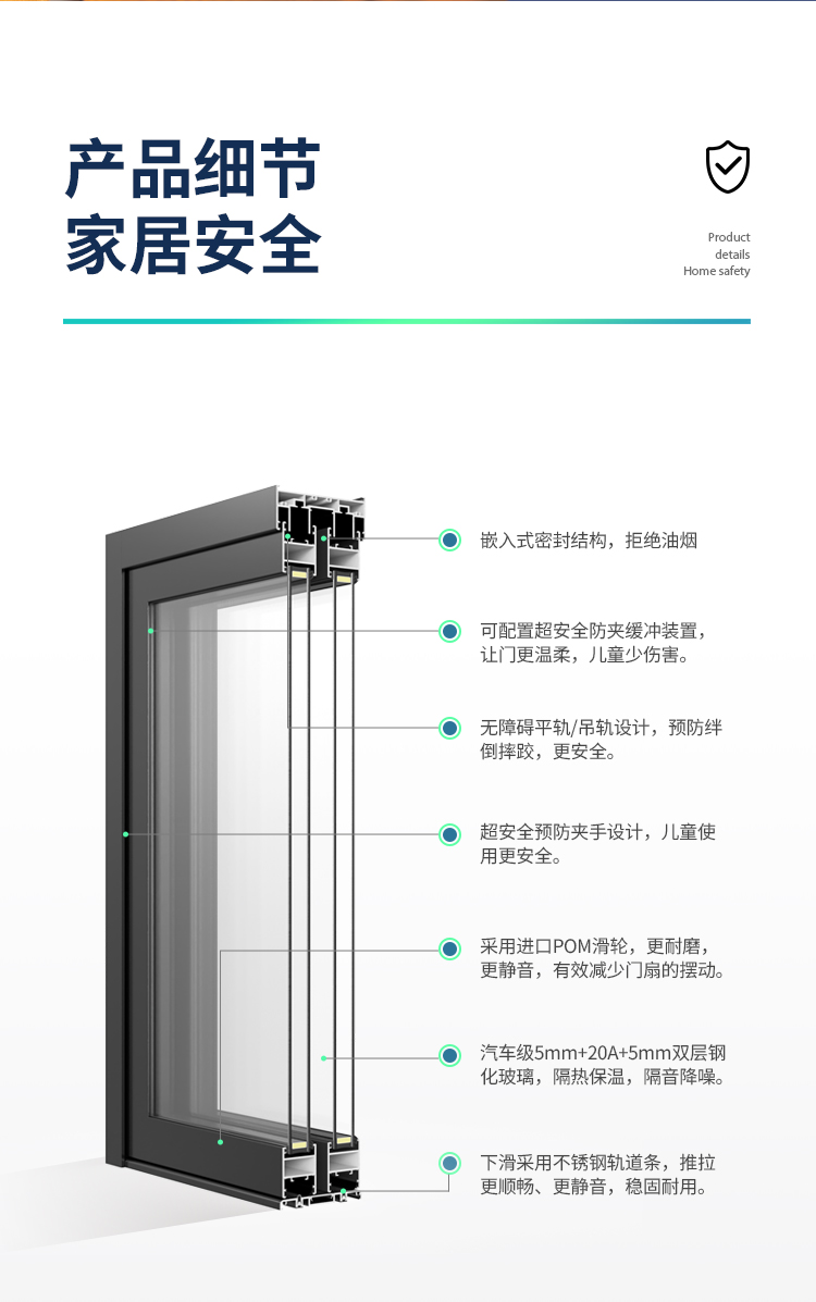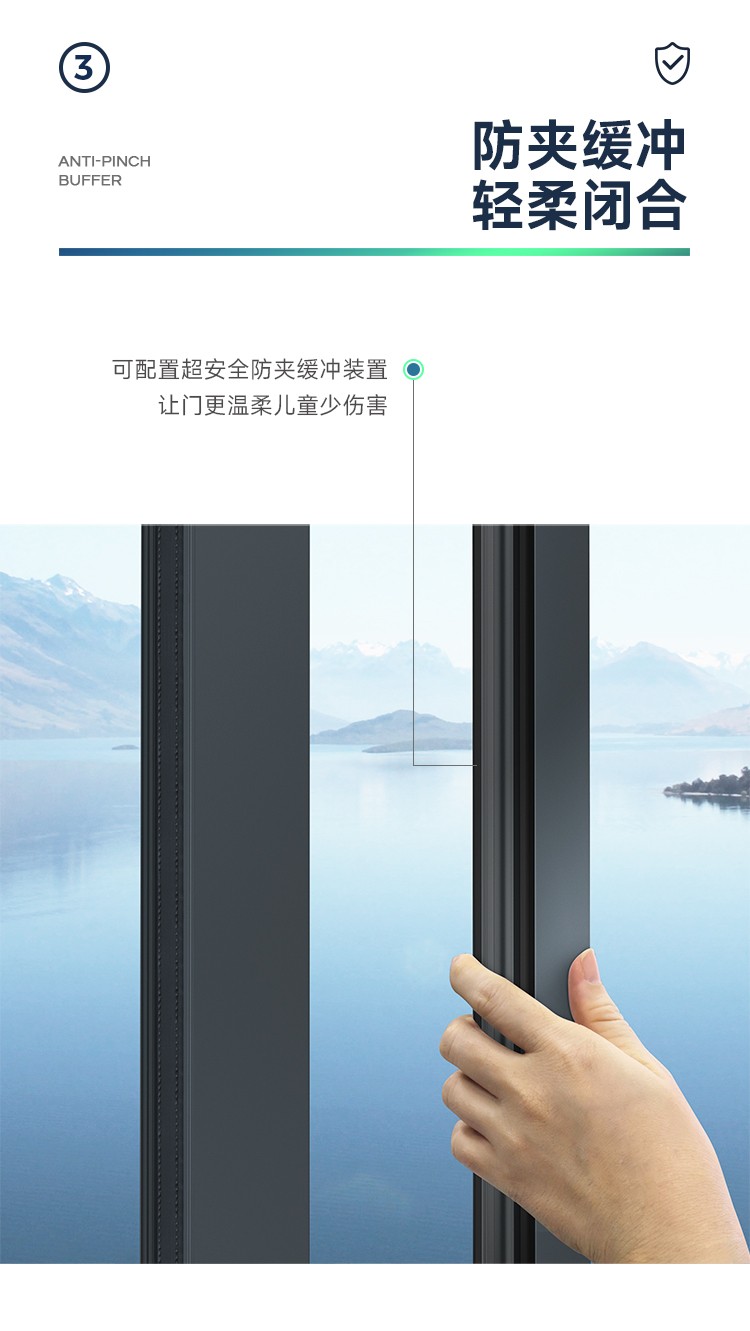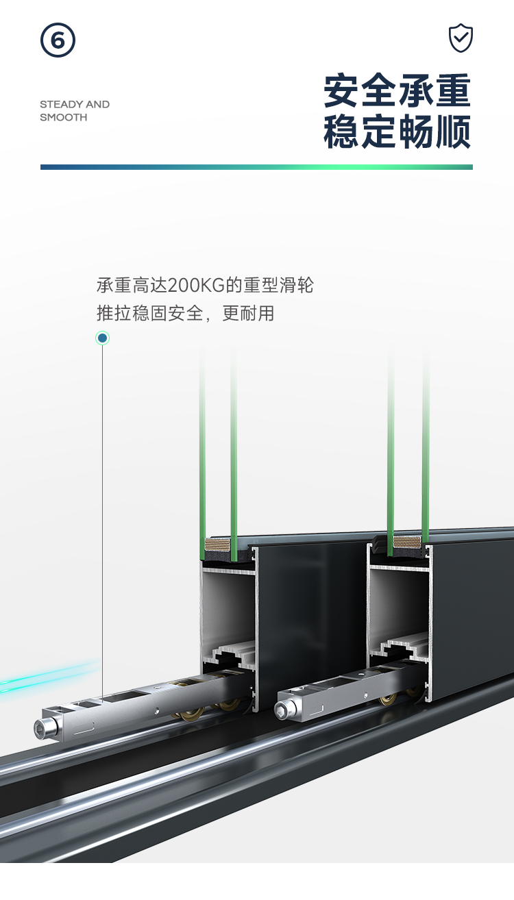 >新國標2.3mm壁厚;微邊大視野,5.0mm增強抗壓; >大中空鋼化玻璃,采用雙膠條減震密封設計,隔音效果更好; >超安全重型滑輪,承重200KG; >超安全防撬鎖點設計,更安全; >可配置超安全防夾緩沖裝置,讓門更溫柔,兒童少傷害; >防水軌道、無障礙平軌,滿足室內(nèi)外的不同需求; >磁懸浮升級款,盡享智慧生活。