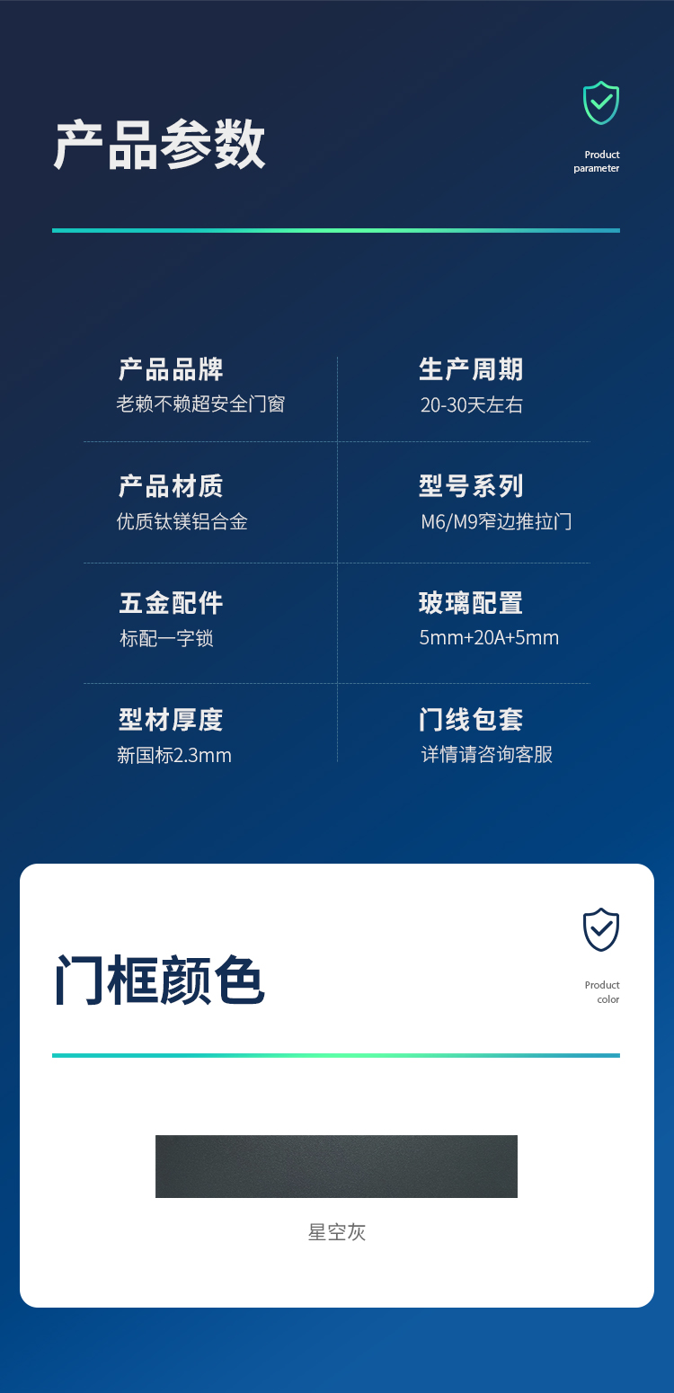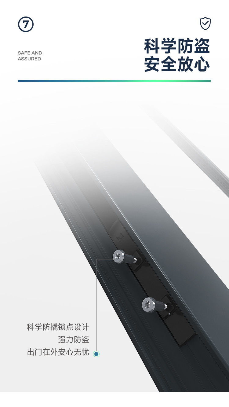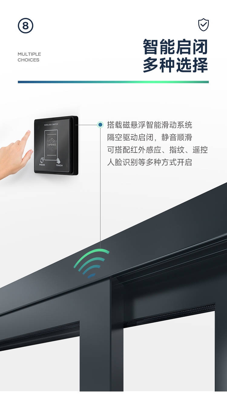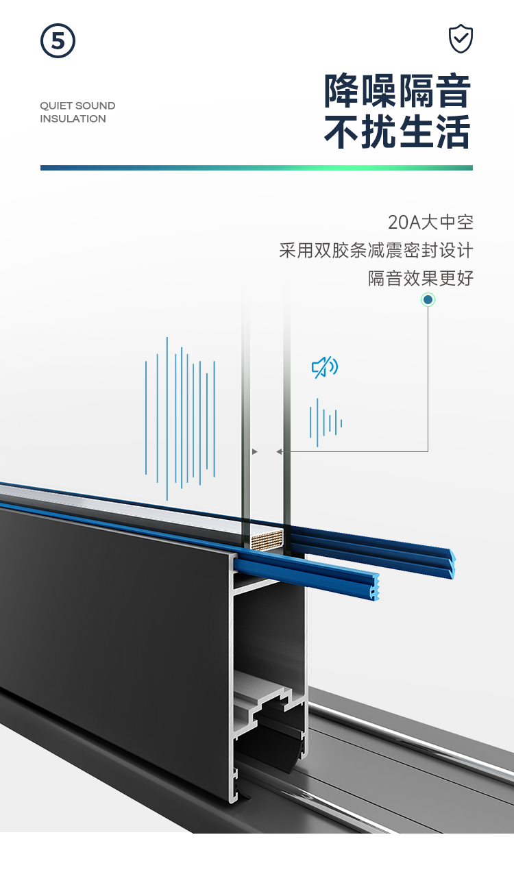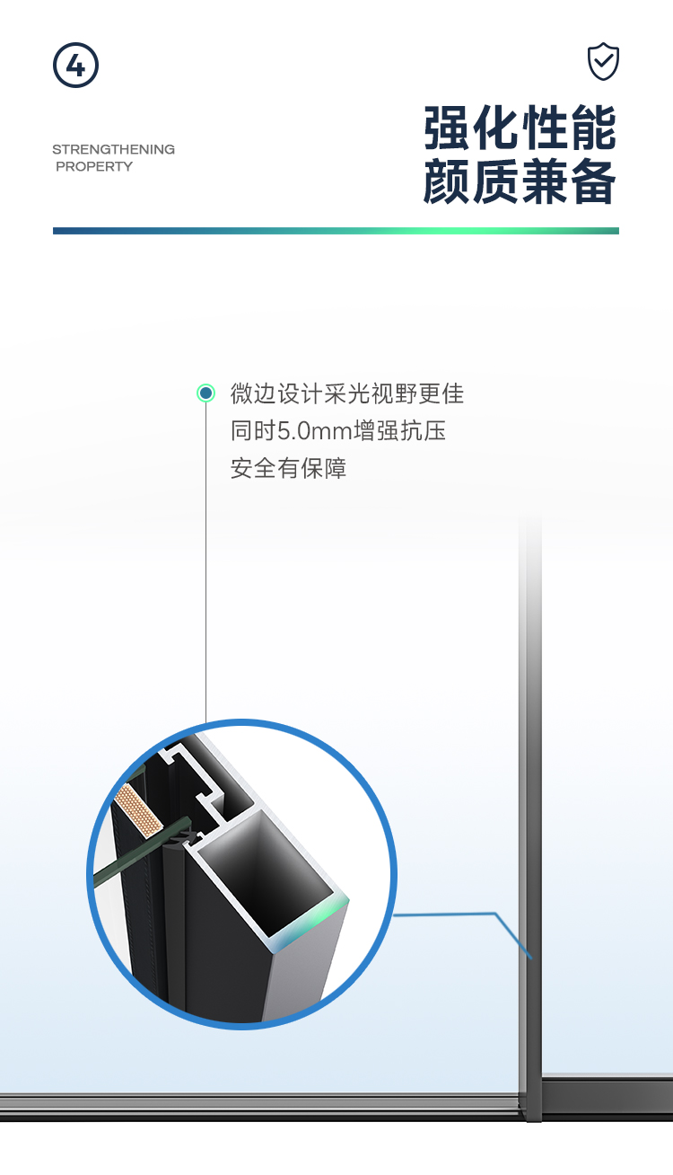 >新國標2.3mm壁厚;微邊大視野,5.0mm增強抗壓; >大中空鋼化玻璃,采用雙膠條減震密封設計,隔音效果更好; >超安全重型滑輪,承重200KG; >超安全防撬鎖點設計,更安全; >可配置超安全防夾緩沖裝置,讓門更溫柔,兒童少傷害; >防水軌道、無障礙平軌,滿足室內(nèi)外的不同需求; >磁懸浮升級款,盡享智慧生活。